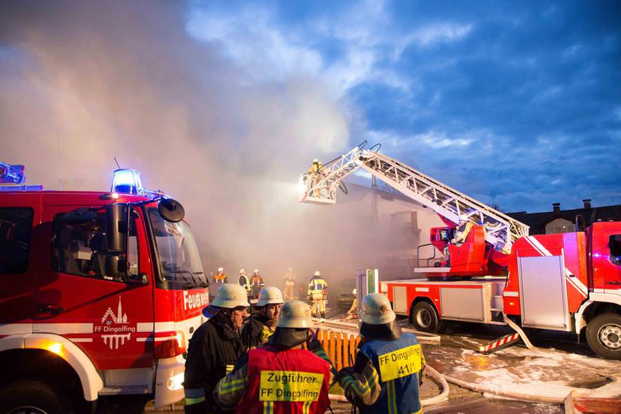 Die Feuerwehren Lengthal und Höfen wurden zu einem PKW Brand in einer Garage nach Lengthal alarmiert. Beim Eintreffen der Feuerwehr Lengthal wurde eine Werkstatt, welche direkt zwischen zwei Wohnhäuser gebaut war, im Vollbrand mit offenem Dachstuhlbrand vorgefunden. Durch die ILS Landshut wurde aufgrund der Rückmeldung sofort eine Alarmstufe erhöht. Die Feuerwehr Dingolfing rückte gemäß Anforderung mit einem Löschgruppenfahrzeug und mit der Drehleiter aus. Vor Ort wurden die Kräfte der FF DGF durch den Einsatzleiter vorerst zur Errichtung einer Wiederstandslinie auf der Südwestseite der Garage sowie zur Abschnittsleitung eingesetzt. Aufgrund der massiven Rauchentwicklung und dem erforderlichen Einsatz von weiteren Atemschutzgeräteträgern im Innenangriff sowie der schlechten Wasserversorgung wurden zusätzlich ein weiteres Löschgruppenfahrzeug, der Einsatzleitwagen sowie die Feuerwehren Mengkofen, Rimbach, Moosthenning und Dornwang alarmiert. Vom Rettungsdienst waren zwei RTW, ein NA und der ELRD vor Ort. Von der Kreisbrandinspektion waren KBI Meier, KBM Dausend und KBM Schmid anwesend. Im weiteren Verlauf des Einsatzes wurde der Löschzug der Feuerwehr Dingolfing gemeinsam mit der Feuerwehr Lengthal im Abschnitt Nord zur Brandbekämpfung von Außen, sowie zur Sicherung der beiden Wohnhäuser im Innenangriff eingesetzt. Die Feuerwehr Höfen übernahm mit Kräften der Feuerwehr Mengkofen die Brandbekämpfung bzw. Riegelstellung im Abschnitt Süd. Die Feuerwehr Moosthenning übernahm die Verkehrsführung bzw. -sperrung um die Einsatzstelle. Die Feuerwehren Rimbach und Dornwang erstellten Wasserleitungen für die Einsatzstelle. Nachdem sich die Brandbekämpfung aufgrund baulicher Gegebenheiten sehr schwierig darstellte, und das Schadenfeuer weiterhin mit einer erheblichen Rauchentwicklung einher ging, wurde der Abrollbehälter Atemschutz vom Landkreis Dingolfing-Landau zur Versorgung der Kräfte mit Atemschutzgeräten und Masken-Filterkombinationen an die Einsatzstelle beordert. Die Feuerwehr Niederviehbach errichtete ein Schnelleinsatzzelt, welches den eingesetzten Kräften als Pausen-, Versorgungs- und Aufwärmmöglichkeit diente. Von der Gemeinde Moosthenning wurde ein Bagger angefordert, welcher die Einsatzkräfte bestens beim Abtragen des Werkstattdaches unterstützte. Nach mehreren Stunden intensiver Brandbekämpfung konnte „Feuer aus“ gemeldet werden. Die Werkstatt war komplett ausgebrannt, die beiden Wohnhäuser konnten bis auf minimalste Rauch- und Wasserschäden durch die anwesenden Feuerwehren gehalten werden. Über den Einsatzleitwagen der Feuerwehr Dingolfing wurden div. Fachstellen und der Bürgermeister der Gemeinde Moosthenning verständigt, sowie eine Lage- und Funkprotokollierung durchgeführt. Durch die Feuerwehren der Gemeinde Moosthenning wurde bis zum Mittag des Folgetages eine Brandwache am Schadenort gestellt. Für die Wiederherstellung der Einsatzbereitschaft an der Feuerwache Dingolfing wurde der Gerätewart aus der Freizeit in die Wache beordert.