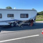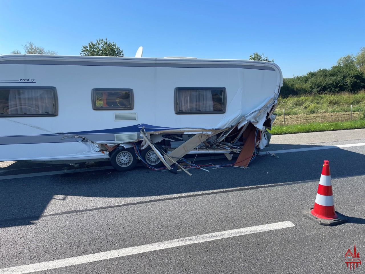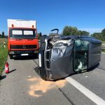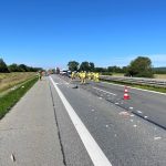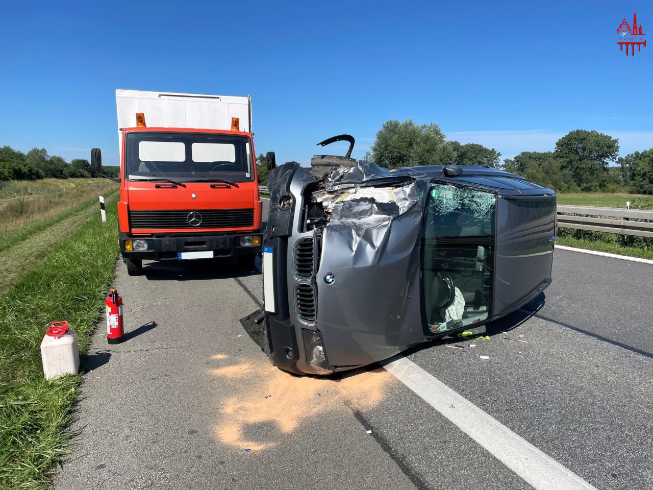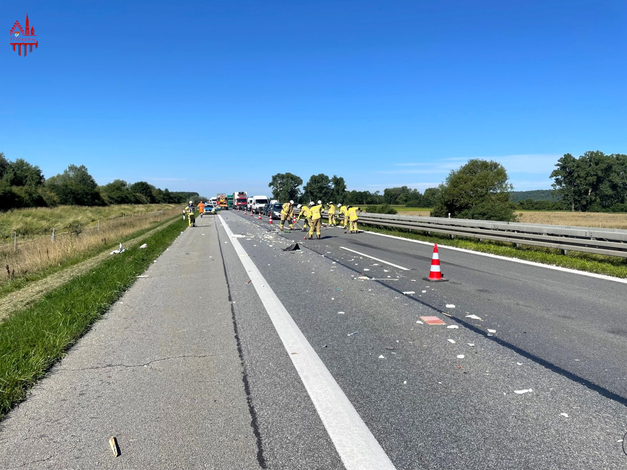 Unser Rüstzug wurde zu einem Verkehrsunfall mit PKW-Überschlag auf die A92 zwischen den Anschlussstellen Dingolfing-Ost und Pilsting/Großköllnbach in Fahrtrichtung Deggendorf alarmiert, wobei laut Alarmmeldung zunächst unklar war, ob sich noch Personen im Fahrzeug befinden. An der Einsatzstelle bestätigte sich ein Verkehrsunfall zwischen einem PKW und einem Wohnanhänger mit einem Trümmerfeld über beide Fahrspuren auf einer Länge von ca. 200 Meter. Der verunfallte PKW befand sich vor einem Gespann aus LKW mit Wohnanhänger auf der rechten Fahrspur in Seitenlage auf der Fahrerseite, der PKW-Lenker war bereits aus dem Fahrzeug befreit und wurde vom Rettungsdienst versorgt. Weitere eingeklemmte oder verletzte Personen bestätigten sich nicht. Die Einsatzkräfte errichteten mit dem VSA eine Vollsperre der Autobahn, der MTW übernahm die Vorwarnung. Die Besatzungen des HLF’s und RW’s stellten den Brandschutz sicher, banden auslaufende Betriebsstoffe und führten das Batteriemanagement durch. Im beschädigten Wohnanhänger wurde eine Gasflasche geborgen und auf Beschädigung kontrolliert, um eine weitere Gefahr durch diese auszuschließen. Nach der Unfallaufnahme durch die Polizei und Abtransport des verletzten Fahrers durch den Rettungsdienst wurde bis zum Eintreffen der Kräfte der Autobahnmeisterei die Überholspur von Trümmerteilen gereinigt. Anschließend übernahm diese die weitere Absicherung und Reinigung der Einsatzstelle mittels Kehrmaschine, bis die Fahrzeuge durch ein Abschleppunternehmen geborgen waren.