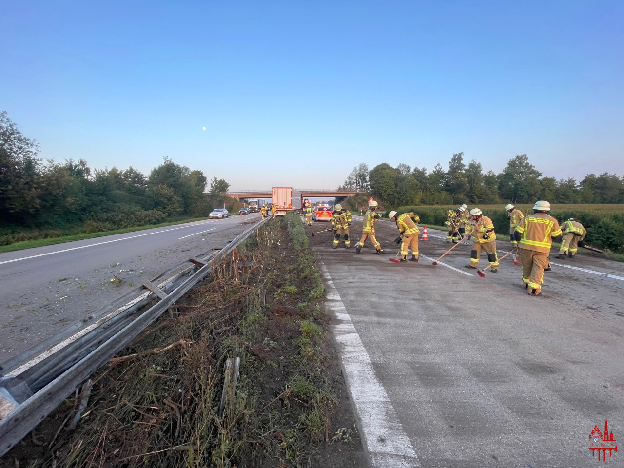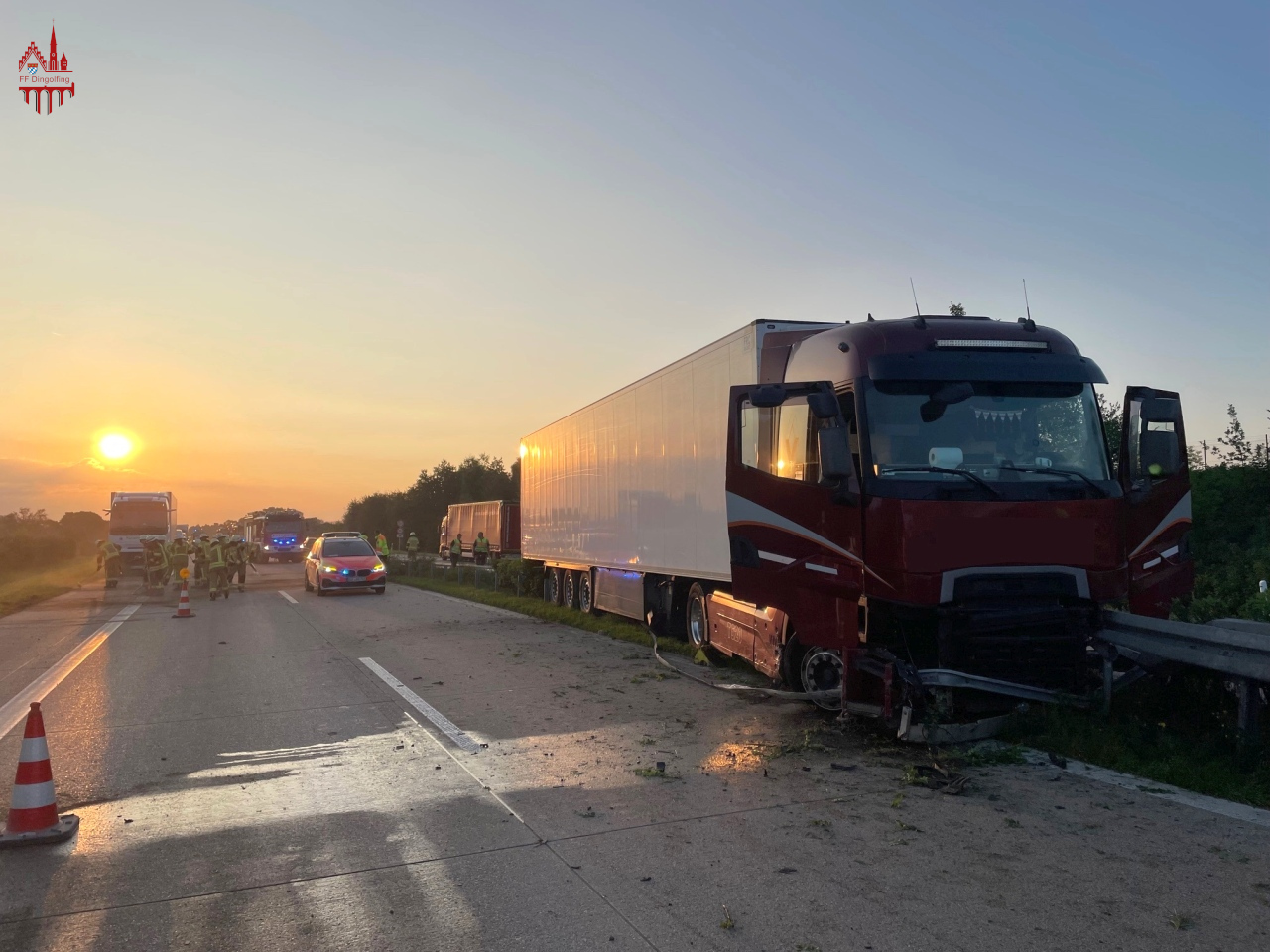 Zusammen mit der Feuerwehr Höfen wurden wir aufgrund eines verunfallten LKW in der Mittelleitplanke auf die A92 Fahrtrichtung München zwischen den Anschlusstellen Dingolfing-West und der Behelfsausffahrt Rothaus alarmiert. Noch auf Anfahrt konnte die gemeldete Lage bestätigt werden, ein LKW ist in der Mittelleitplanke verunfallt, es laufen Betriebsstoffe aus, das Trümmerfeld erstreckt sich bis auf die Gegenfahrbahn. Aufgrund der verschmutzen Gegenfahrbahn wurde im Laufe des Einsatzes durch die Feuerwehr Höfen die Feuerwehren Niederviehbach und Wörth zu dessen Reingung nachalarmiert. In Zusammenarbeit mit der Feuerwehr Höfen wurden nach der Unfallaufnahme durch die Polizei die Fahrspuren gereinigt und die auslaufenden Betriebsstoffe gebunden. Durch den Verkehrssicherungsanhänger wurden für die Dauer der Arbeiten beide Fahrspuren gesperrt. Die Sperrung übernahm für die weitere Reinigung und Bergungsarbeiten des LKW die Autobahnmeisterei.