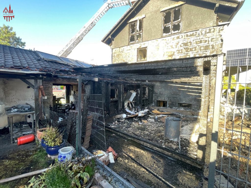 Noch auf der Anfahrt wurde von der Einsatzleitung das Stichwort auf B4 erhöht, da der Garagenbrand bereits auf das Wohnhaus überge...
