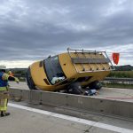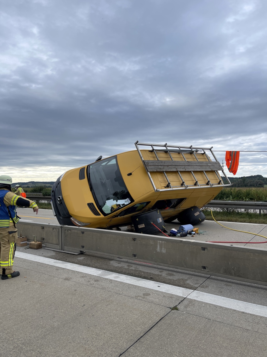 Die Feuerwehren Höfen und Dingolfing wurden durch die Bosch Sicherheitsleitstelle über die Leitstelle Landshut zu einem Verkehrsunfall auf die BAB A 92, in Fahrtrichtung Deggendorf, zwischen den Anschlussstellen Dingolfing West und Dingolfing Mitte alarmiert. Bereits auf der Anfahrt meldete die Feuerwehr Höfen, dass sich die Zufahrt zur Unfallstelle im Baustellenbereich aufgrund des bereits entstandenen Rückstaues und einer fehlenden Rettungsgasse schwierig gestalten würde. Des weiteren wurde bei deren Eintreffen festgestellt, dass ein Kleintransporter ohne Fremdeinwirkung und Beteiligung weiterer Fahrzeuge auf der Fahrstraße über beide Spuren auf der Fahrerseite zum liegen kam. Der Fahrer befand sich nicht mehr im Fahrzeug und wurde durch die FF Höfen bis zum Eintreffen des Rettungsdienstes erstversorgt. Nachdem die BAB in Fahrtrichtung Deggendorf hinter der Unfallstelle durch das quer liegende Fahrzeug komplett gesperrt war, entschied sich der Zugführer der Feuerwehr Dingolfing die Einsatzkräfte des Hilfeleistungslöschfahrzeuges und des Rüstwagens über die Anschlussstelle Dingolfing Mitte entgegen der Fahrtrichtung auffahren zu lassen. Die Kräfte des TroLF mit dem Verkehrssicherungsanhänger und des MTW mit der Vorwarntafel wurden bis zur AS Wörth entsandt, wendeten dort und erstellten an der Anschlussstelle Dingolfing West eine Ausleitung. Die Sperrung der Zufahrt zur BAB an der AS Dingolfing West übernahm die Besatzung des Mehrzweckfahrzeuges der Feuerwehr Höfen. An der Unfallstelle wurde, in Zusammenarbeit mit der Feuerwehr Höfen und nach Freigabe der Besatzung der APS Wörth, der Brandschutz sichergestellt und die Fahrbahn von auslaufenden Betriebsstoffen sowie herumliegenden Fahrzeugteilen gereinigt. In Abstimmung mit dem mittlerweile eingetroffenen Abschleppdienst wurde das Unfallfahrzeug unter Zuhilfenahme der Seilwinde des Hilfeleistungslöschgruppenfahrzeuges und eines Mehrzweckzuges welcher am Löschgruppenfahrzeug der Feuerwehr Höfen angeschlagen wurde, sowie dem Einsatz zweier Niederdruckhebekissen wieder auf die Räder gestellt, so dass das Abschleppunternehmen das KFZ im Anschluss verlasten konnte. Im Rahmen der Rückbauarbeiten stellte die Besatzung des TroLF ein Pannenfahrzeug im Staubereich hinter der Einsatzstelle fest. Nach Abklärung und Freigabe der Polizei wurde das Fahrzeug von der Autobahn auf die Zubringerstraße verbracht. Nachdem die Arbeiten beendet waren, wurde die Einsatzstelle an die anwesende Streifenwagenbesatzung übergeben und alle eingesetzten Kräfte rückten ab.