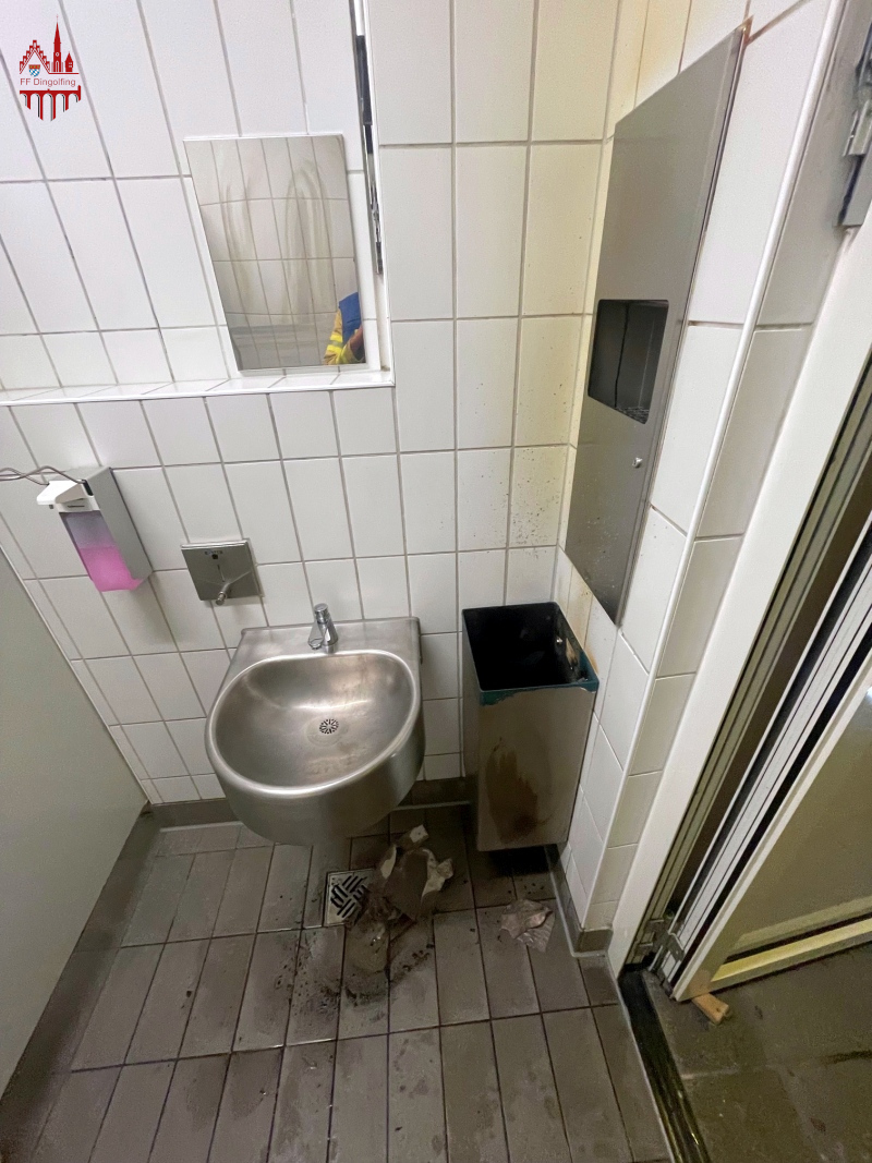 Eine Person wollte eine öffentliche Toilette benutzen, bemerkte Rauch und atmete etwas davon ein. Ein Trupp geschützt mit schwerem Atemschutz und einem C-Rohr löschte den darin befindlichen Brand im Müllbehälter ab. Im Anschluss wurde die Toilette noch mittels Überdrucklüfter belüftet. Die Person wurde durch einen nachgeforderten Rettungswagen versorgt, musste aber in kein Krankenhaus verbracht werden. Nach Beendigung der Arbeiten wurde die Einsatzstelle an die Polizei übergeben.
