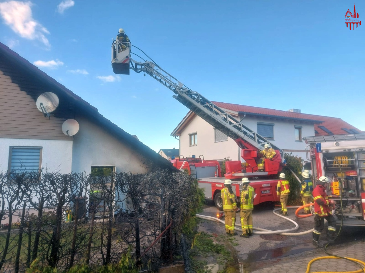 Bei Gartenarbeiten geriet eine Hecke in Brand und Griff auf die angrenzende Garage und das Wohnhaus über. Durch den schnellen Löscheinsatz der Feuerwehr Wörth konnte die Hecke unmittelbar abgelöscht werden. Ein Trupp der Feuerwehr Postau, geschützt mit schwerem Atemschutz übernahm die Kontrolle des Gebäudes und stellte im Bereich des Dachstuhls Rauch und eine Wärmeentwicklung fest. Durch die Drehleiter der Feuerwehr Dingolfing wurde die Dachhaut punktuell geöffnet und betroffene Bereiche möglichst ohne Wasserschaden zu verursachen abgelöscht. Nach umfangreicher Kontrolle mit der Wärmebildkamera und Belüften des Gebäudes konnte das Dach wieder verschlossen werden.