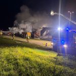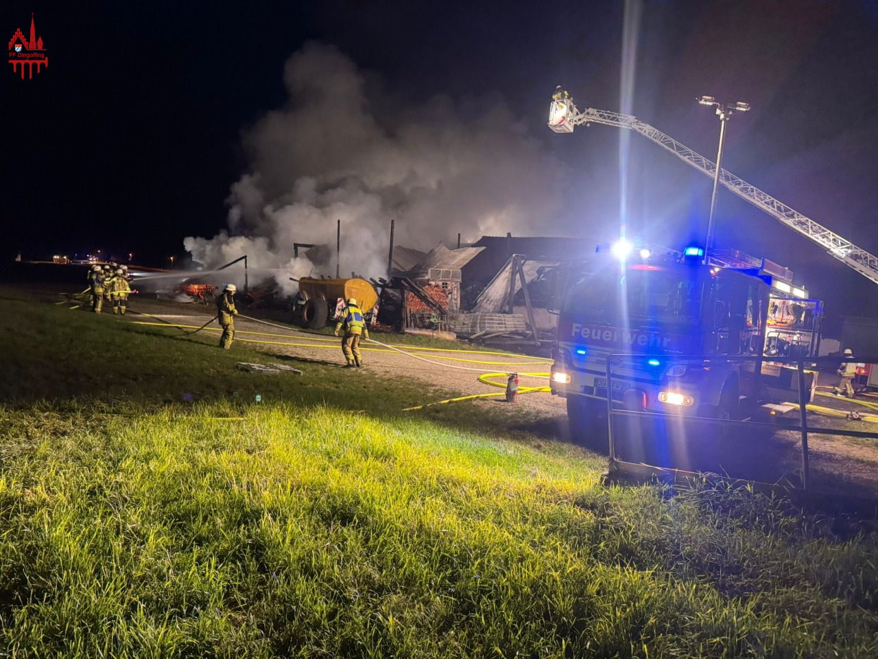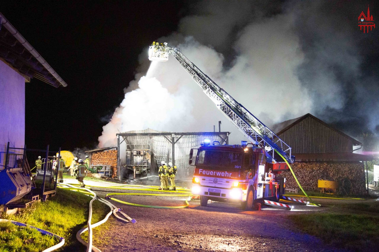 Zusammen mit den Feuerwehren Frauenbiburg, Höfen und Teisbach wurden wir mit dem Löschzug und dem Einsatzleitwagen zu einem Brand eines Stalls bzw. einer Scheune in den Ortsteil Mietzing alarmiert. Noch während der Anfahrt konnte die Lage von der bereits an der Einsatzstelle eingetroffenen Ortswehr Frauenbiburg und vom Kreisbrandmeister bestätigt werden. Da sich zu Einsatzbeginn – nach Bestätigung vom Brandleider – keine Menschen und Tiere in Gefahr befanden, begann man sofort mit der Brandbekämpfung. Die Feuerwehr Frauenbiburg errichtete hierzu auf der östlichen Seite des Brandobjekts zunächst eine Riegelstellung zum angrenzenden Gebäude mit zwei C-Rohren, die Feuerwehr Dingolfing übernahm dies auf der Westseite des Gebäudes, ebenfalls mit zwei C-Rohren und dem Wenderohr der in Stellung gebrachten Drehleiter. Da aufgrund der Brandentwicklung und des erhöhten Wasserbedarfs weitere Kräfte nötig waren, wurden im Zuge des weiteren Einsatzes die Feuerwehren Sossau, Frichlkofen, Frontenhausen, Loiching und Weigendorf nachalarmiert. Von einem ca. 200 Meter entfernten Löschteich errichteten die Feuerwehren Teisbach und Weigendorf eine unabhängige Wasserversorgung mit drei B-Leitungen zur Einsatzstelle, um die Löschmittelversorgung für den massiven Löschangriff sicherzustellen. Des Weiteren wurde durch die Tanklöschfahrzeuge der Feuerwehren Sossau und Dingolfing ein Pendelverkehr eingerichtet, der Abrollbehälter Wasser der Feuerwehr Dingolfing wurde ebenfalls in Stellung gebracht. Alle verfügbaren und nicht eingesetzten Atemschutztrupps registrierten sich in der von der Feuerwehr Höfen erstellten Atemschutzsammelstelle und wurden sukzessive zum Einsatz gebracht bzw. lösten die eingesetzten Trupps ab. Die Feuerwehren Höfen, Sossau und Frontenhausen unterstützten weiterhin bei der Brandbekämpfung in den gebildeten Einsatzabschnitten. Zwischenzeitlich wurden in Summe zehn C-Rohre sowie das Wenderohr der Drehleiter zur Brandbekämpfung eingesetzt. Nachdem das Feuer unter Kontrolle gebracht und ein vollständiges Übergreifen auf das angebaute Nachbargebäude verhindert werden konnte, begann man mit dem Ausräumen des Brandguts. Hierbei setzte man einen Teleskoplader sowie einen von einer ortsansässigen Firma hinzugezogenen Bagger ein. Während des gesamten Einsatzes unterstützte der Einsatzleitwagen mit der Lageführung und Dokumentation den Einsatzleiter und führte die o.g. Nachalarmierungen sowie diverse Verständigungen durch. Das BRK Dingolfing übernahm die Verpflegung der Einsatzkräfte mit Heißgetränken und Brotzeit. Nachdem das Brandgut weitestgehend ausgeräumt und abgelöscht war, konnte die unabhängige Wasserversorgung rückgebaut und die Kräfte aller eingesetzten Wehren sukzessive zur Wiederherstellung der Einsatzbereitschaft aus dem Einsatz herausgelöst werden.