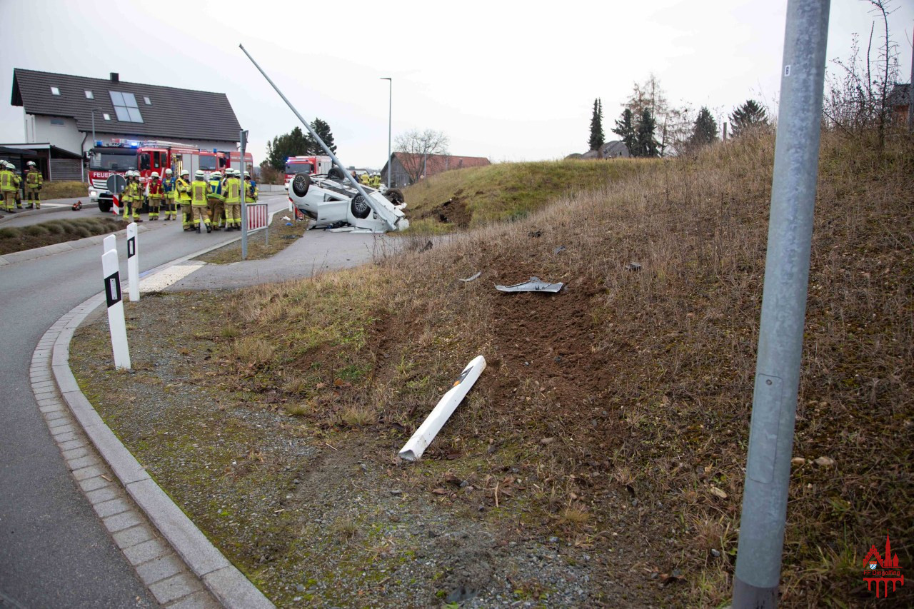 Zusammen mit der Feuerwehr Teisbach wurden wir auf die Ortsverbindungsstraße DGF1 von Teisbach nach Loiching zu einem Verkehrsunfall mit eingeschlossener Person alarmiert. Ein PKW war aus unbekannter Ursache alleinbeteiligt von der Straße abgekommen, über einen Erdhügel abgehoben und an einer Straßenlaterne auf einem Gehweg am Dach zum Liegen gekommen. Durch die Feuerwehr Teisbach konnte die Fahrertüre geöffnet und die Person in Zusammenarbeit mit dem Rettungsdienst aus dem Fahrzeug mittels Spineboard befreit werden. Für die Feuerwehr Dingolfing war kein Eingreifen erforderlich, worauf die Einsatzkräfte zur Feuewache zurückkehrten.