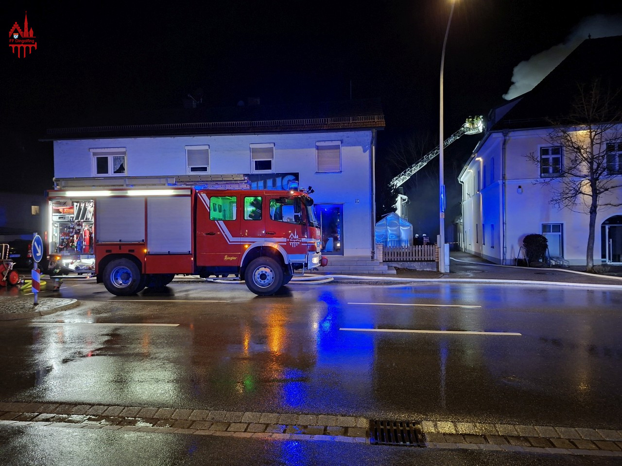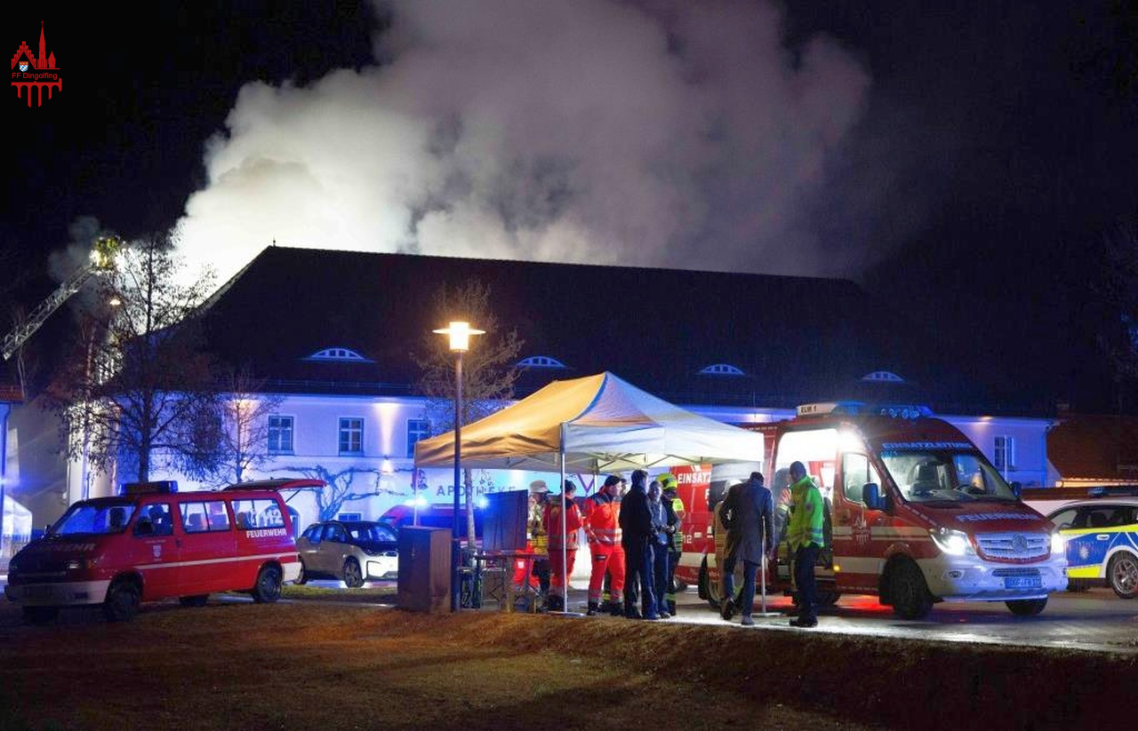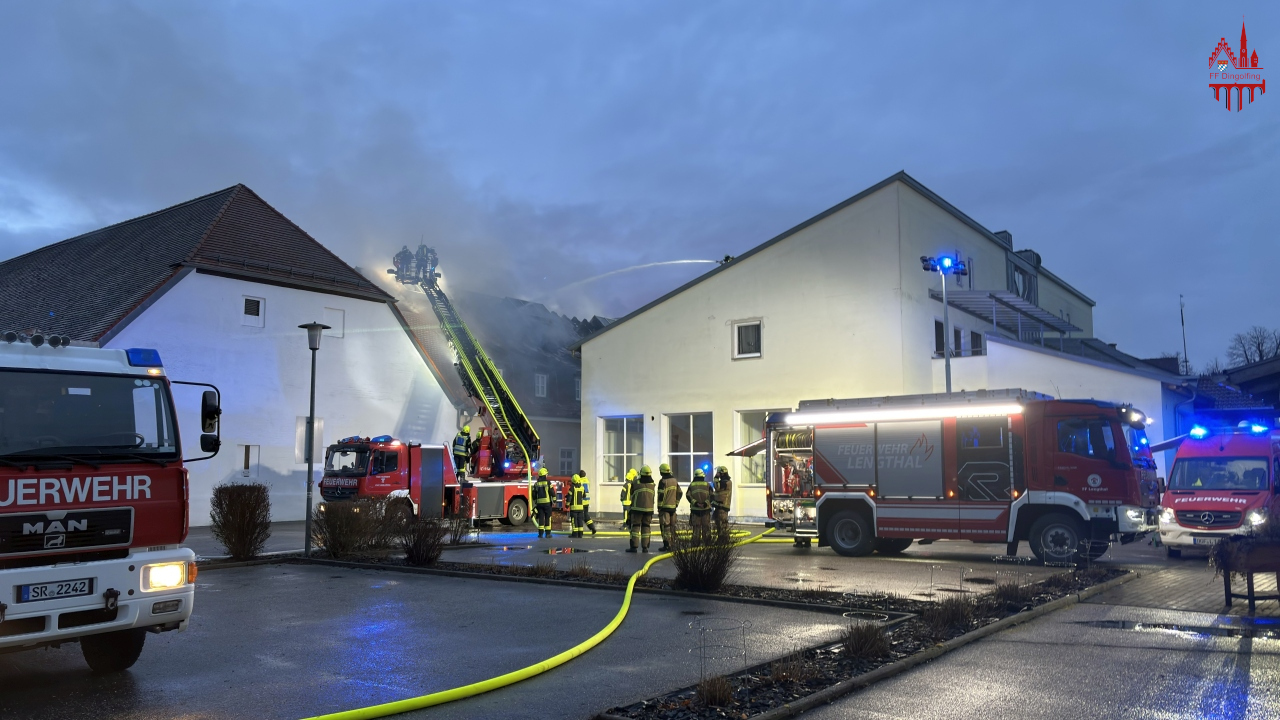 Die Feuerwehr Dingolfing wurde mit der Drehleiter und dem Einsatzleitwagen mit weiteren Feuerwehren zu einem bereits laufenden Einsatz nach Mengkofen nachalarmiert. In einem Landgasthof mit Hotel war es zu einem Brand gekommen, der weitere Kräfte sowie eine zweite Drehleiter erforderlich machte. An der Einsatzstelle angekommen, befand sich der Mitteltrakt des u-förmigen Gebäudes in Brand und Flammen schlugen bereits großflächig aus dem Dachstuhl. Die im Erstalarm alarmierten örtlichen Feuerwehren unter der Einsatzleitung der Feuerwehr Mengkofen hatten das Gebäude bereits evakuiert und mit der Brandbekämpfung über die Drehleiter der Feuerwehr Mengkofen sowie einem Innenangriff an der Ostseite begonnen. Die Kräfte aus Dingolfing brachten an der Westseite die Drehleiter in Stellung, um ein Übergreifen der Flammen mittels Wenderohr auf das südlich angebaute Hauptgebäude, u.a. mit Hotelzimmern und mehreren Geschäftsräumen, zu verhindern. Weiterhin wurde ein zusätzlicher Außenangriff an der Westseite gestartet. Um eine erfolgreiche Brandbekämpfung durchzuführen, musste das Dach vom Korb der Drehleiter aus sukzessive geöffnet werden. Aufgrund der baulichen Gegebenheiten und des Brandfortschrittes kam eine dritte Drehleiter der Feuerwehr Geiselhöring sowie weitere C-Rohre im Außenangriff zum Einsatz, um ein Übergreifen der Flammen auf einen angebauten Stadel an der Nordseite zu verhindern. Im weiteren Verlauf des Einsatzes wurden weitere Feuerwehren zur Unterstützung nachalarmiert. Nachdem die Maßnahmen Wirkung zeigten, das Brandausmaß auf das vorgefundene Maß beschränkt und eine weitere Brandausbreitung verhindert werden konnte, begann man mit dem vollständigen Ablöschen des Mitteltraktes. Hierzu wurde das Dach weiter großflächig geöffnet, u.a. mittels Kettensäge und Trennschleifer. Die Feuerwehr Dingolfing setzte abwechselnd insgesamt fünf Atemschutztrupps im Korb der Drehleiter ein. Der Einsatzleitwagen unterstützte den Einsatzleiter mittels Lageführung, Dokumentation und veranlasste diverse Verständigungen und Nachalarmierungen. Insgesamt wurden in vier Einsatzabschnitten sieben C-Rohre im Innen- und Außenangriff sowie drei Wenderohre über Drehleitern eingesetzt. Weiterhin wurde von der Feuerwehr Höfen und Niederviehbach eine Atemschutzsammelstelle errichtet und Fachberater des THW unterstützten bei der Beurteilung der Gebäudestatik. Nach rund sechs Stunden Einsatz konnten die Kräfte aus Dingolfing zur Wiederherstellung der Einsatzbereitschaft an die Feuerwache zurückkehren. Die Feuerwehr Mengkofen verblieb für restliche Nachlöscharbeiten und einer Brandwache an der Einsatzstelle.