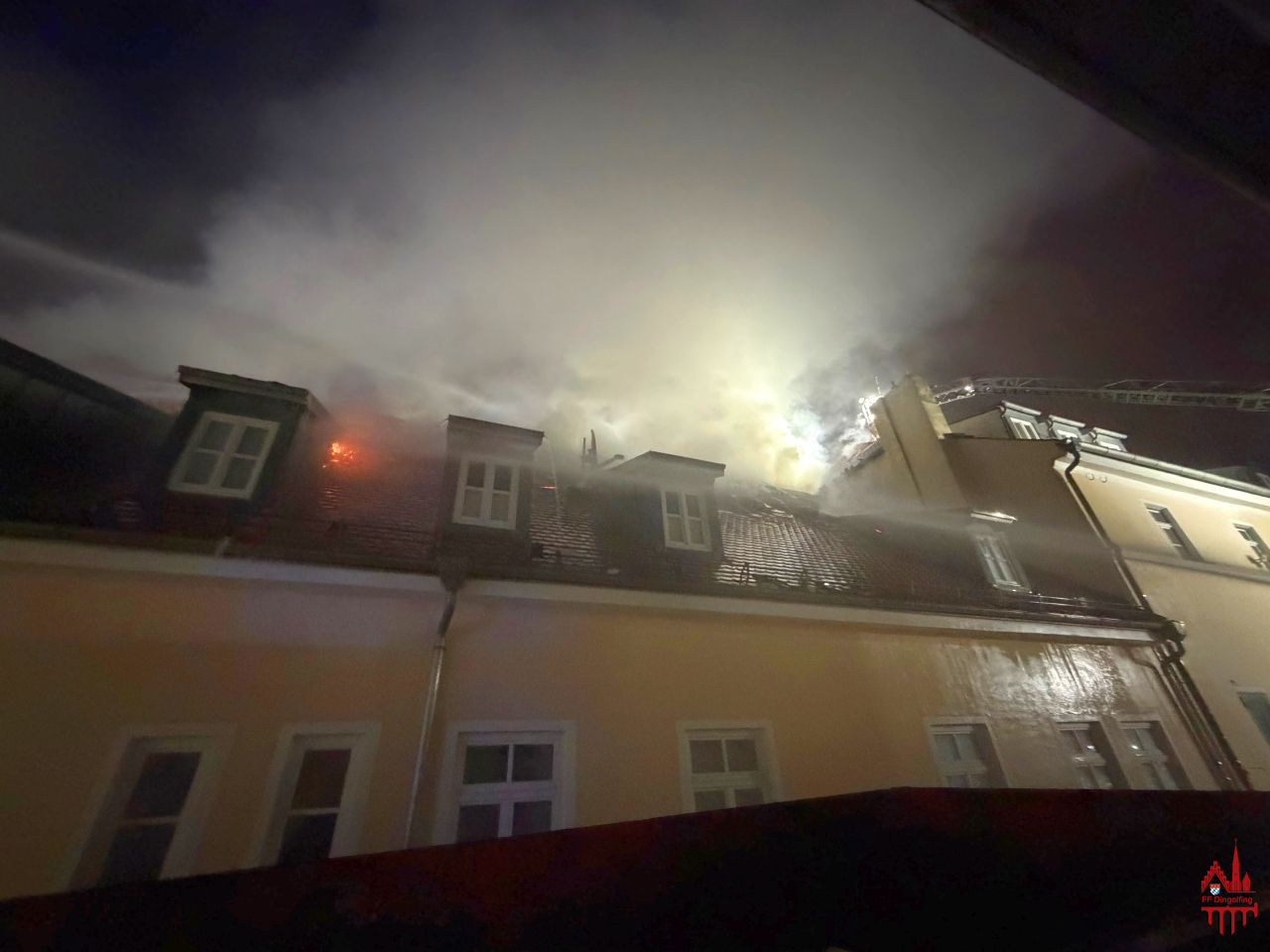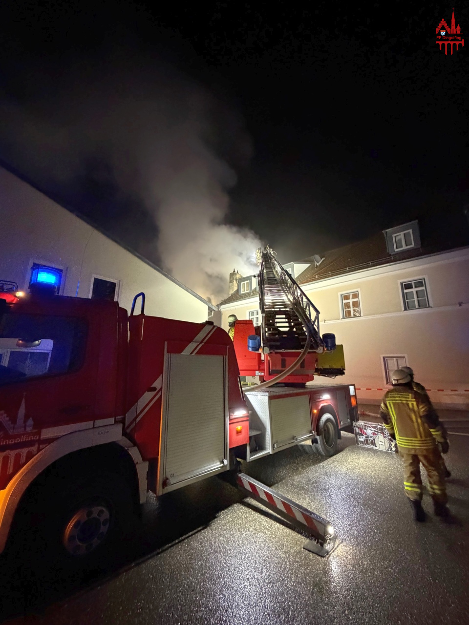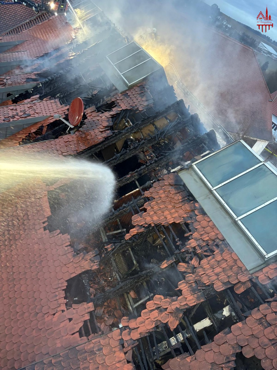 Die Feuerwehr Dingolfing wurde mit der Drehleiter und dem Einsatzleitwagen mit weiteren Feuerwehren zu einem bereits laufenden Einsatz nach Mengkofen nachalarmiert. In einem Landgasthof mit Hotel war es zu einem Brand gekommen, der weitere Kräfte sowie eine zweite Drehleiter erforderlich machte. An der Einsatzstelle angekommen, befand sich der Mitteltrakt des u-förmigen Gebäudes in Brand und Flammen schlugen bereits großflächig aus dem Dachstuhl. Die im Erstalarm alarmierten örtlichen Feuerwehren unter der Einsatzleitung der Feuerwehr Mengkofen hatten das Gebäude bereits evakuiert und mit der Brandbekämpfung über die Drehleiter der Feuerwehr Mengkofen sowie einem Innenangriff an der Ostseite begonnen. Die Kräfte aus Dingolfing brachten an der Westseite die Drehleiter in Stellung, um ein Übergreifen der Flammen mittels Wenderohr auf das südlich angebaute Hauptgebäude, u.a. mit Hotelzimmern und mehreren Geschäftsräumen, zu verhindern. Weiterhin wurde ein zusätzlicher Außenangriff an der Westseite gestartet. Um eine erfolgreiche Brandbekämpfung durchzuführen, musste das Dach vom Korb der Drehleiter aus sukzessive geöffnet werden. Aufgrund der baulichen Gegebenheiten und des Brandfortschrittes kam eine dritte Drehleiter der Feuerwehr Geiselhöring sowie weitere C-Rohre im Außenangriff zum Einsatz, um ein Übergreifen der Flammen auf einen angebauten Stadel an der Nordseite zu verhindern. Im weiteren Verlauf des Einsatzes wurden weitere Feuerwehren zur Unterstützung nachalarmiert. Nachdem die Maßnahmen Wirkung zeigten, das Brandausmaß auf das vorgefundene Maß beschränkt und eine weitere Brandausbreitung verhindert werden konnte, begann man mit dem vollständigen Ablöschen des Mitteltraktes. Hierzu wurde das Dach weiter großflächig geöffnet, u.a. mittels Kettensäge und Trennschleifer. Die Feuerwehr Dingolfing setzte abwechselnd insgesamt fünf Atemschutztrupps im Korb der Drehleiter ein. Der Einsatzleitwagen unterstützte den Einsatzleiter mittels Lageführung, Dokumentation und veranlasste diverse Verständigungen und Nachalarmierungen. Insgesamt wurden in vier Einsatzabschnitten sieben C-Rohre im Innen- und Außenangriff sowie drei Wenderohre über Drehleitern eingesetzt. Weiterhin wurde von der Feuerwehr Höfen und Niederviehbach eine Atemschutzsammelstelle errichtet und Fachberater des THW unterstützten bei der Beurteilung der Gebäudestatik. Nach rund sechs Stunden Einsatz konnten die Kräfte aus Dingolfing zur Wiederherstellung der Einsatzbereitschaft an die Feuerwache zurückkehren. Die Feuerwehr Mengkofen verblieb für restliche Nachlöscharbeiten und einer Brandwache an der Einsatzstelle.