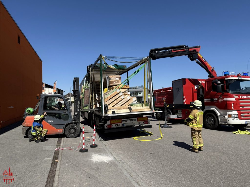 Alarmierung zu einem Sattel-LKW, der aufgrund verrutschter Ladung umzustürzen drohte. An der Einsatzstelle zeigte sich ein Sattelau...